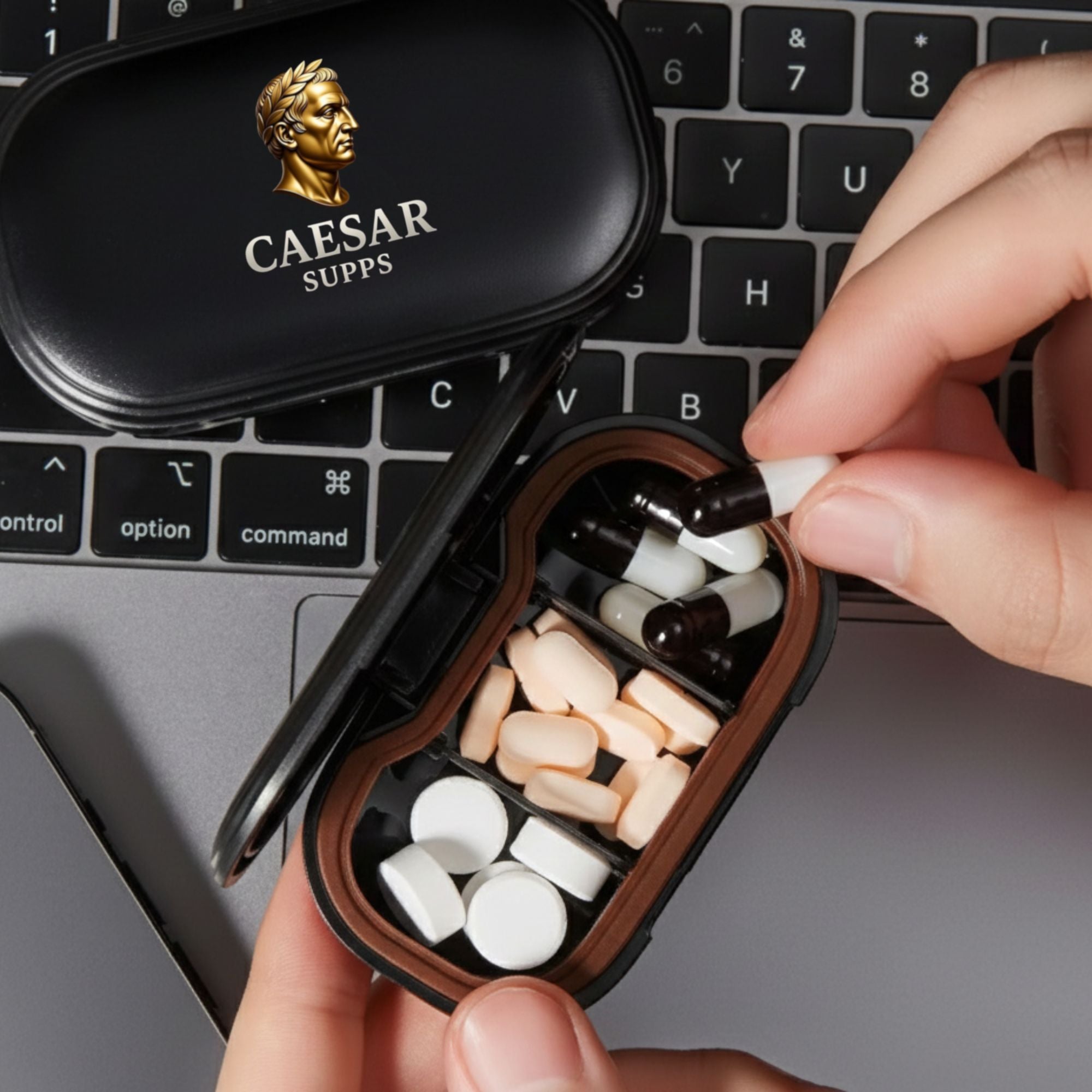 The Caesar Supps Pill Case features a secure snap-lock closure with a food-grade silicone sealing ring to help protect your capsules and tablets from moisture, odors, and contamination.